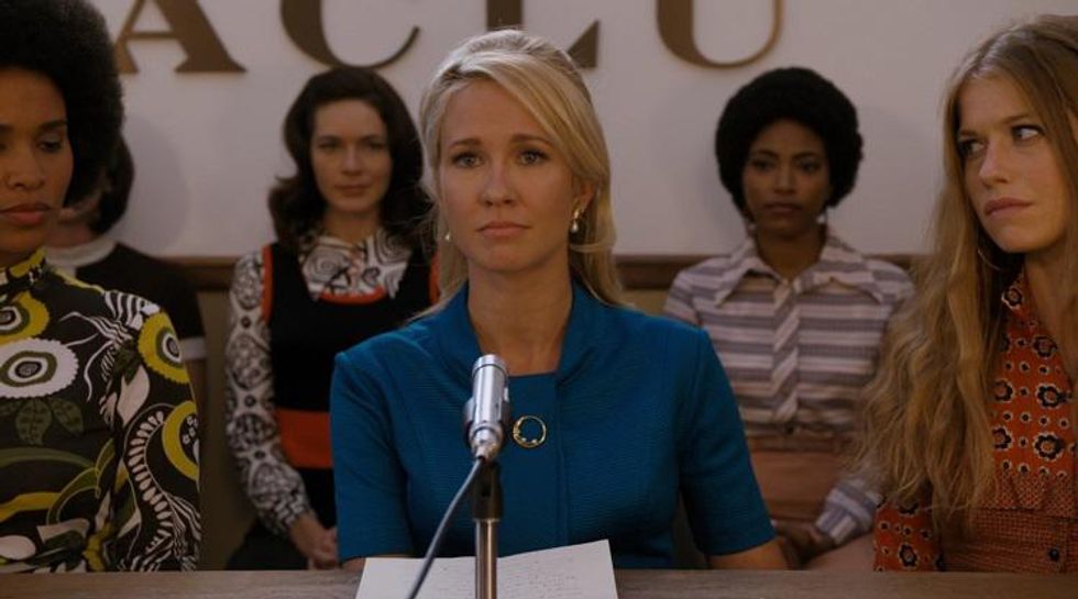 But outside of their experiences at work, their lives couldn’t be more different. Patti Robinson (Genevieve Angelson) is the pot-smoking sexually liberated foil to Jane Hollander (Anna Camp), a woman still dependent on her wealthy father’s money who insists she’s biding her time at News of the Week until she marries her fiancé. Erin Darke gives a standout performance as Cindy Reston, a quiet researcher married to an oblivious law student who finds herself wanting more after consciousness raising meetings. Joy Bryant (Parenthood) plays Eleanor Holmes Norton, the researchers’ lawyer who enjoys a successful egalitarian marriage and a challenging career.