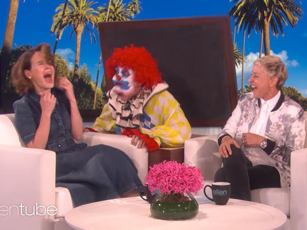 Sarah Paulson appeared on The Ellen Show yesterday to promote American Horror Story: Cult, in which she's a lesbian mom who's terrorized by clowns, anxiety, and Trump supporters.