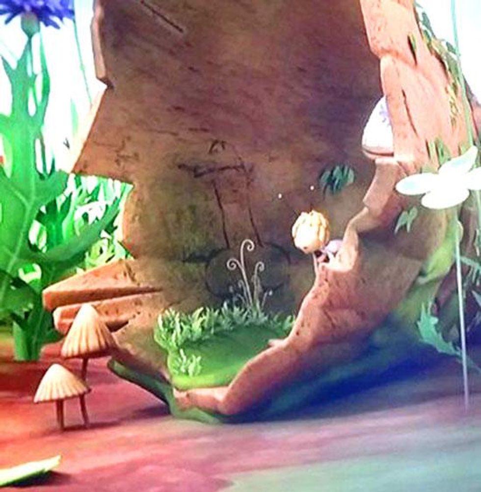 At about five minutes into episode 35 of this otherwise innocent animated series's first season, we see Maya the bee make her way through a fallen log. As she exits, she passes a large phallus (complete with testes) drawn on the wall behind her.