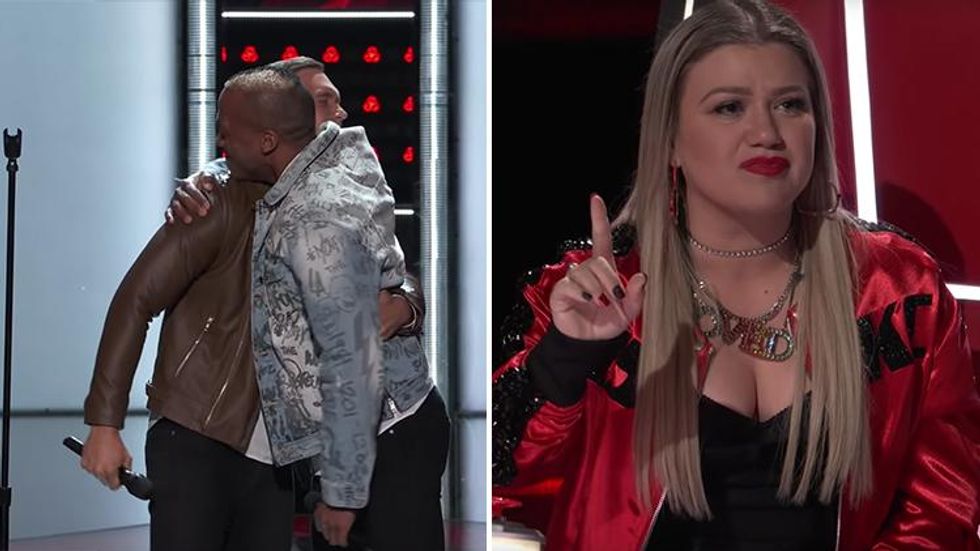 This week on The Voice, singing duo Adam and Jerome — aka OneUp — impressed judges Adam Levine, Kelly Clarkson, Jennifer Hudson, and Blake Shelton with their rendition of the Spinners’ “Could It Be I’m Falling in Love." They then revealed that they're actually a couple who fell for each other after becoming singing partners.