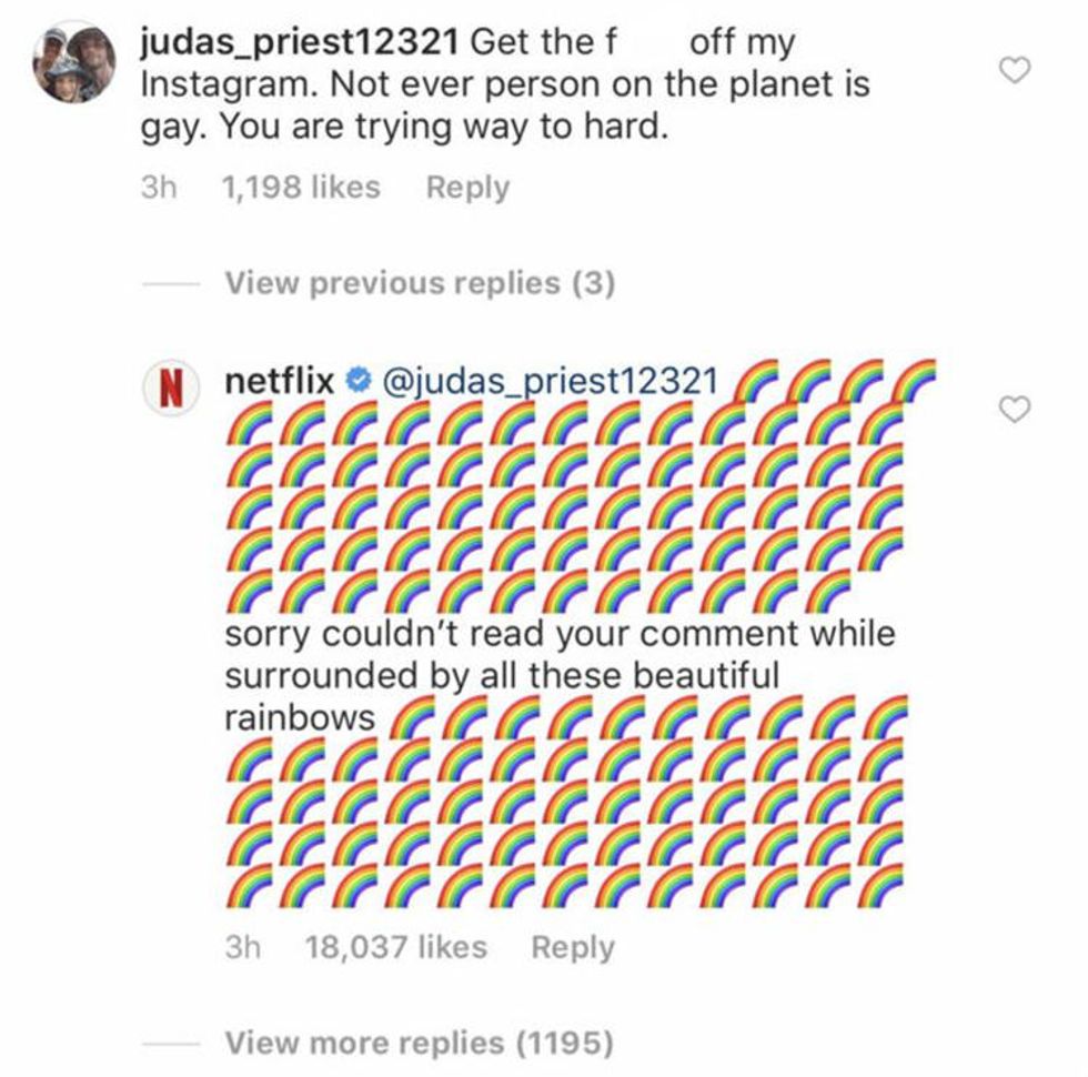 "wtf Netflix and their stupid liberal agenda," wrote one commenter. "All gays are going to hell yall push this s**t to corrupt the world gays are nasty & all of them going to hell," said another. When one guy commented, "Get the fuck off my Instagram. Not ever[y] person on the planet is gay. You are trying way too hard," Netflix decided to clap back.