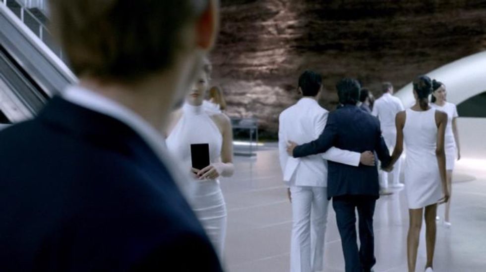 In Season 1, Episode 2, as Logan and William take their first steps into Westworld, they're given a robot of their own to walk them through their new surroundings. Logan walks away holding hands with a female android and his arm wrapped around a male.