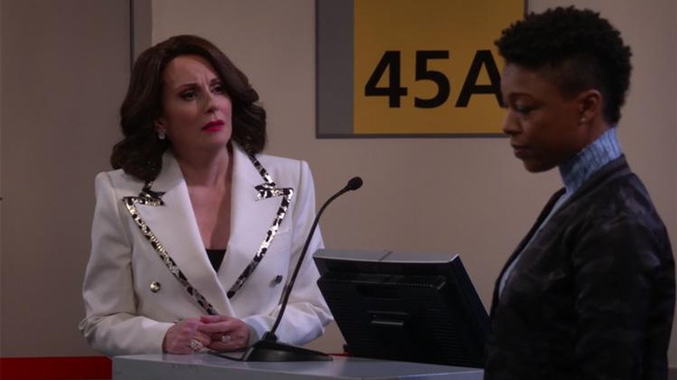 In the finale, which takes place entirely in an airport, she realizes she can’t date Nikki anymore, because she’s not really gay. Her moment of truth comes when she leans over the podium and comes out to Nikki as straight — into the microphone and over the whole airport’s speaker system.