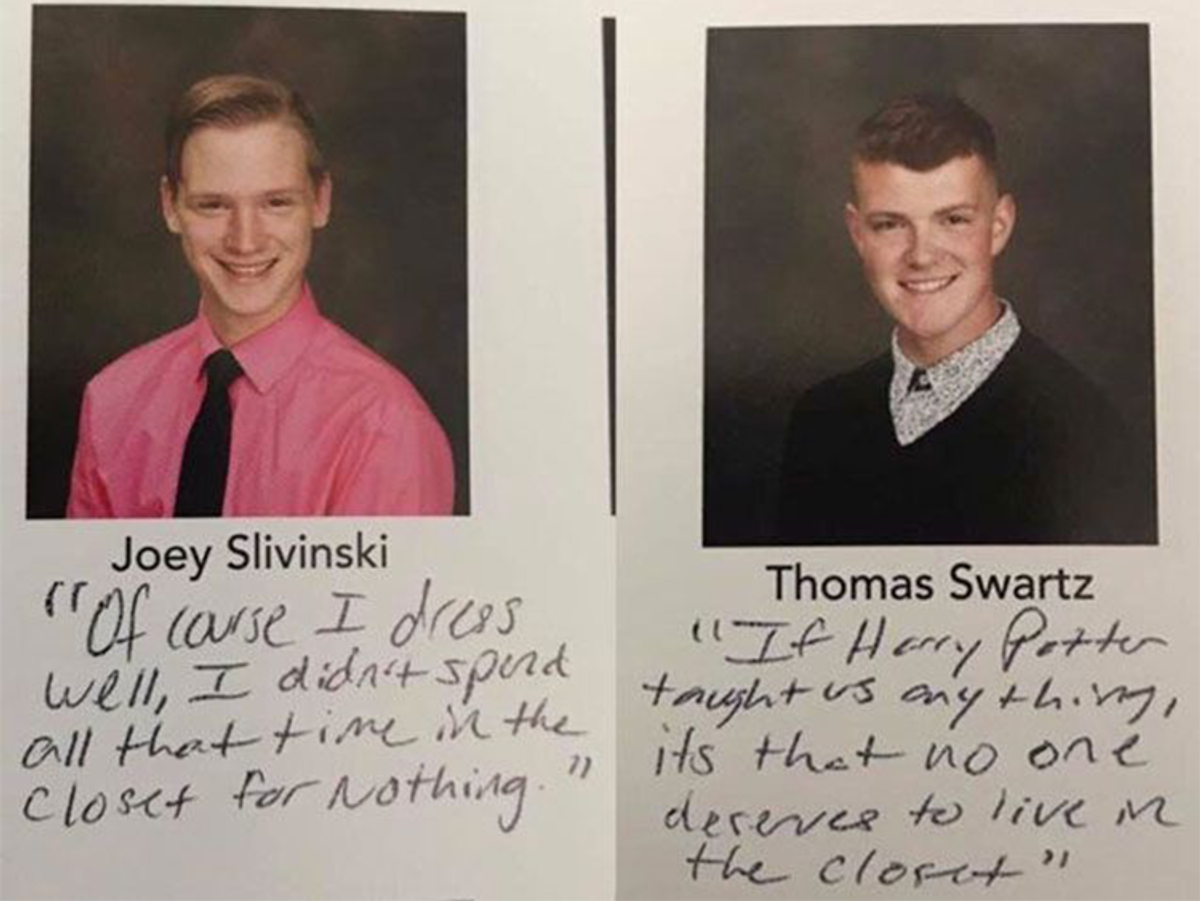 Joey Slivinski and Thomas Swartz, who are both openly gay at Kearny High School, chose innocent quotes alluding to coming out. "Of course I dress well, I didn’t spend all that time in the closet for nothing," Slivinski's read. Swartz wrote, "If Harry Potter taught us anything, it’s that no one deserves to live in the closet."