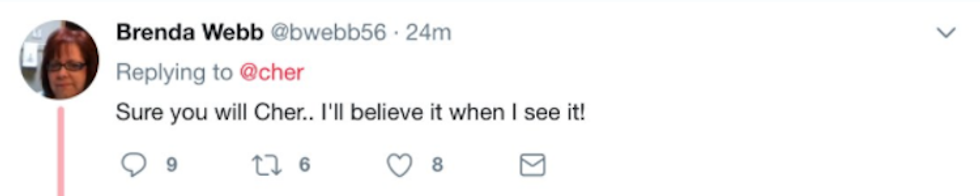 Twitter user Brenda Webb was...skeptical, to say the least of Cher's intentions.