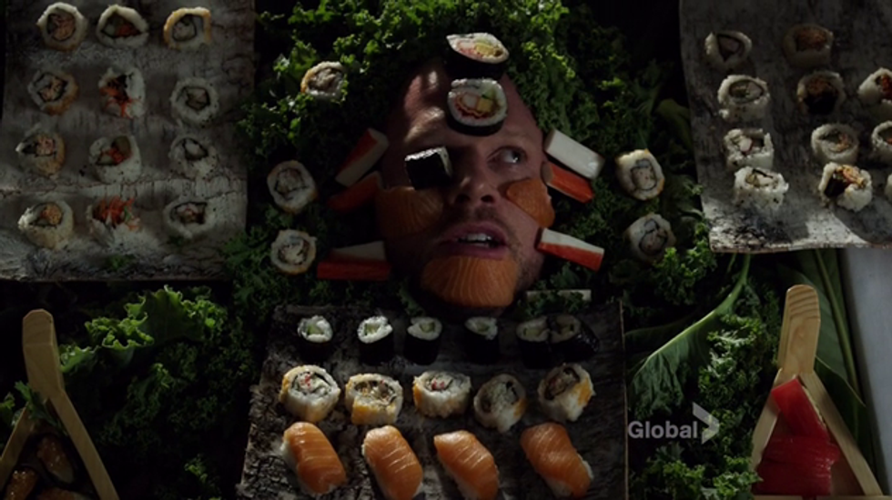 Back at the well-lit, daylight hours ceilidh of darkness my second favorite fae-human team investigate the sushi buffet only to discover it is served on a delicious tray of Bruce. Kenzi's old body guard buddy is suffering this punishment for helping her out last season. I've got to give it to these dark fae, they know how to come up with inventive retribution. Kenzi basically agrees describing the light fae as assholes and the dark as “assholes who have fun.” She disapproves of this current method of fun and in her search to clothe Bruce also discovers the bride and groom who actually paid for this party murdered under a tablecloth.