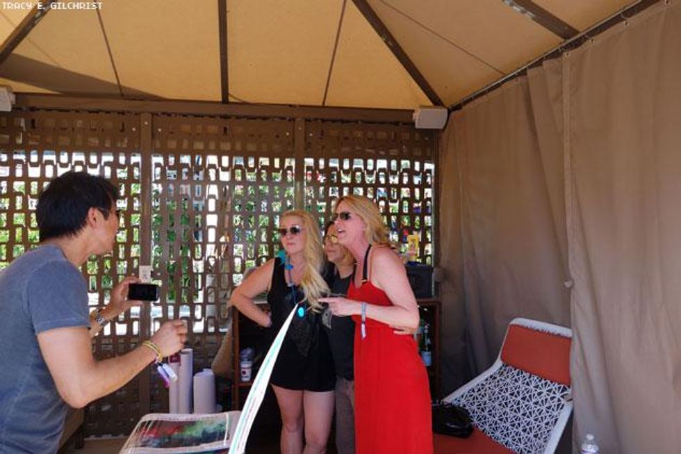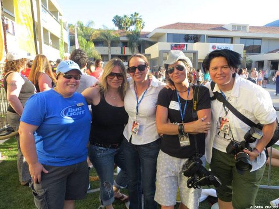 Working hard. Hilton Palm Springs Manager Shannon Anderson, Tracy G., Sirius Radio's Doria Biddle, Beck Starr, and Connie Kurtew