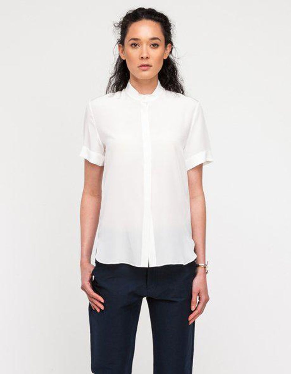 This look is Ellen Page in 2008, so let's upgrade it to a more modern feel while still keeping the playful qualities. I recommend a short sleeve button up shirt like this cuffed Studio Nicholeson Carmelo Silk Shirt. $141.99
