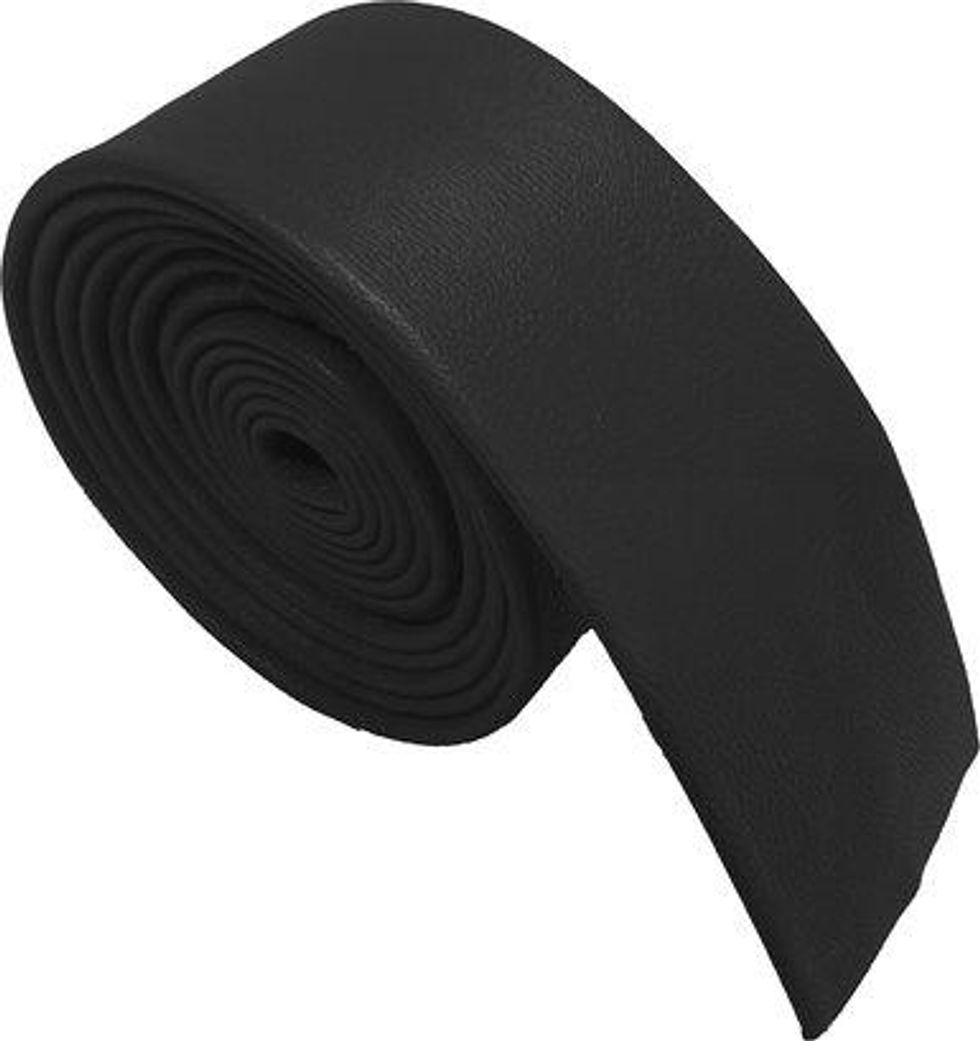 Any black skinny tie will do, my favorite ones are leather because it gives it a little more weight. These run at about $20.00