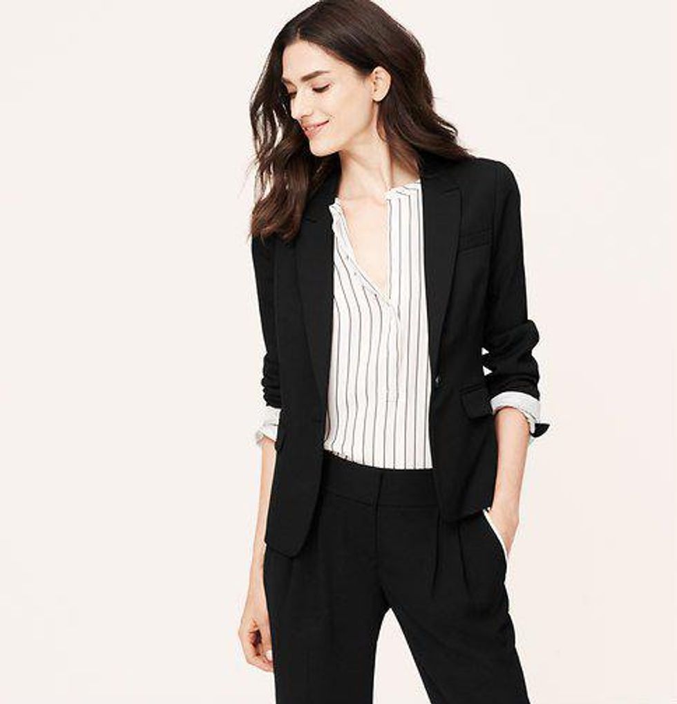 Needless to say that any offerings pale in comparison to the above picture. But you can come close. Look for a blazer that is custom stretched in heritage gray with black detail, like the one above. It will create a relaxed, superbly sleek vibe that accentuates and flattens in all the right places. Here's one that promises to do just that from LOFT for 128.00