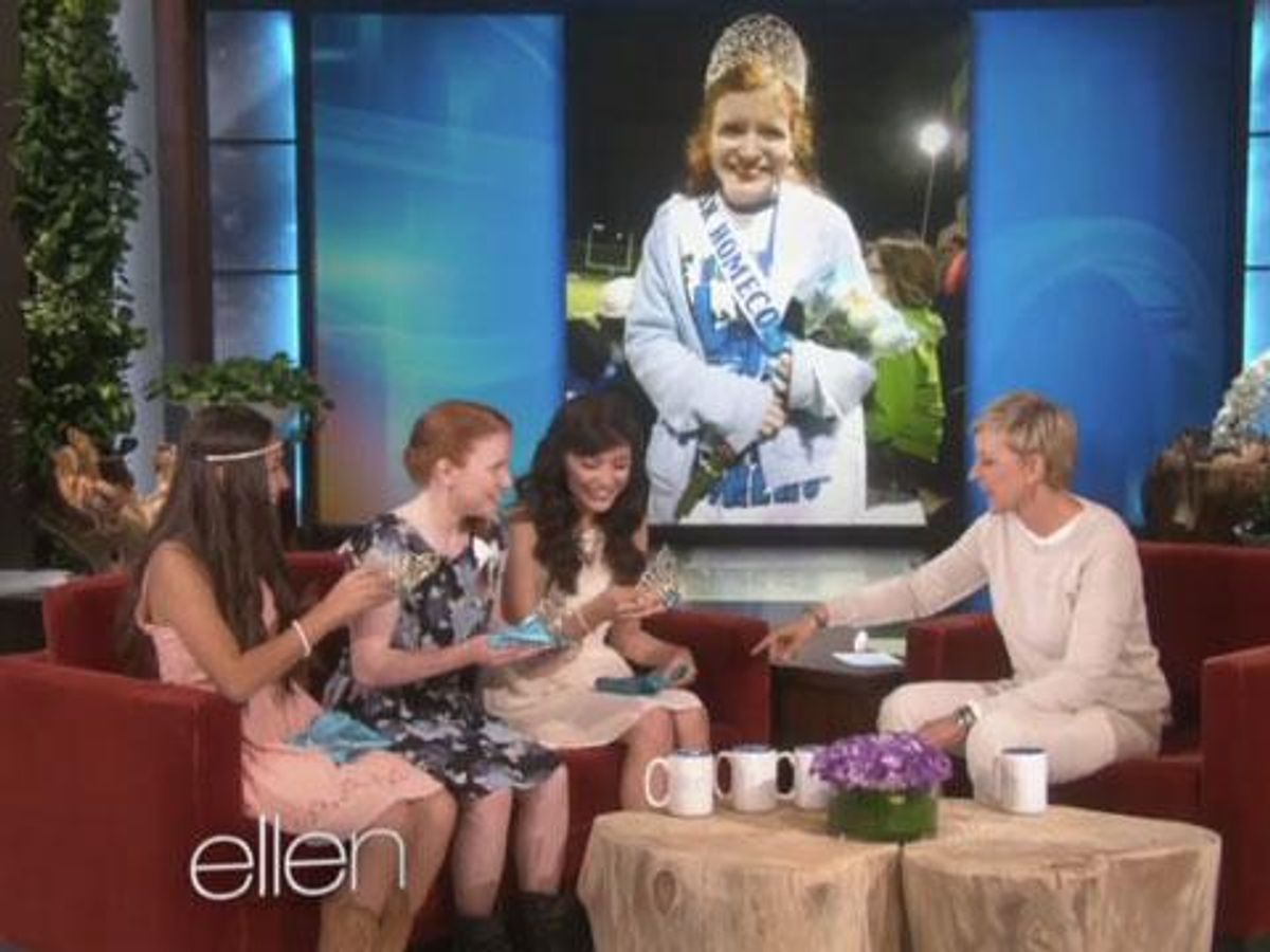 When Naomi Martinez and Anahi Alvarez heard their longtime friend Lillian Skinner had been nominated for homecoming queen, they were thrilled. When the ballots were released and it turned out that the rumor of Lillian's nomination had been a cruel joke made by high school bullies, the girls decided to take a stand. Naomi and Anahi, who had both been nominated themselves, made a pact that if one of them won, they'd happily turn over the crown to its rightful owner, Lillian. And so the night of the homecoming game when Anahi won the crown, she immediately called Lillian up before the whole school and gave it to her instead. The world took notice of this beautiful act of friendship and so did Ellen, who welcomed the girls to her show and announced a few big surprises. Today's society rarely gets to see a story of bullying end on such a hopeful, uplifting note, and we're so glad to see that Naomi, Anahi, and Lillian's story is spreading so publicly. Watch the girls' visit to Ellen right here, and prepare to get a little teary-eyed!