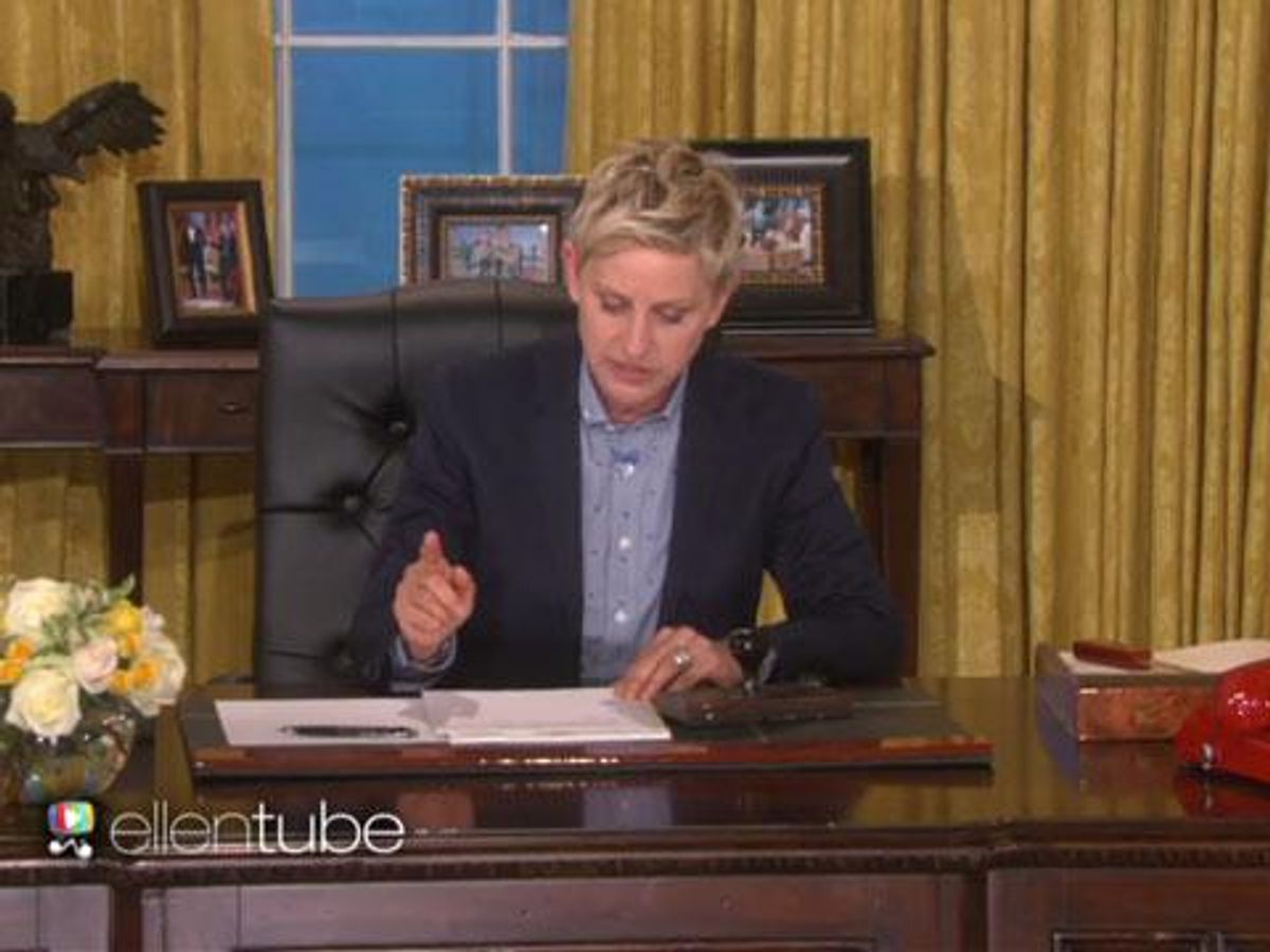 Inspired by a "Winfrey/DeGeneres 2016" bumper sticker that Ellen DeGeneres spotted on her way to work, she imagines a world in which she is actually President. In a country run by Ellen there is surely more dancing, but she also tackles the tough issues like how get rid of indecisive Starbucks customers, banning people from singing "Let it Go" in public, and decreeing the baby goat the country's official animal. These are only a few examples of what Madame President DeGeneres would do for this country. See what else she has in mind below.