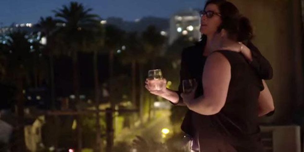 The palm trees in the background, the fuzzy street lights, the glasses of (what I hope are) wine, all set the scene for our first lesbian-couple-in-Hillary's-ad-who-made-me-cry. I just love the way the one leans so casually and comfortably against her lady.